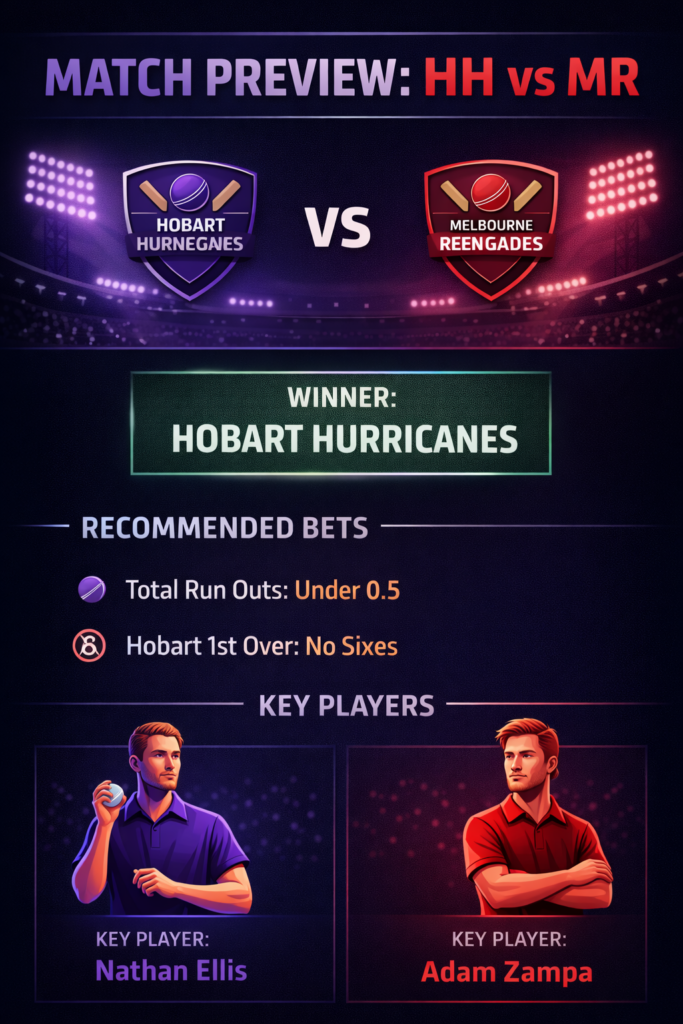 The statistics paint a clear picture: The Hurricanes have won 9 of their last 11 encounters against the Renegades. In betting, form and history are your best friends. The Renegades look like a side losing the race to save their season, while Hobart is surging at the right time.
