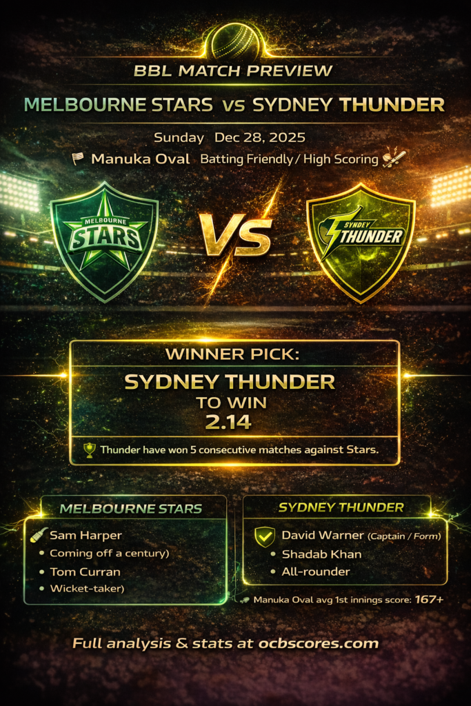 The Sydney Thunder has established complete dominance over the Melbourne Stars in recent years. The Thunder has won five consecutive matches against the Stars, a psychological edge that cannot be ignored.