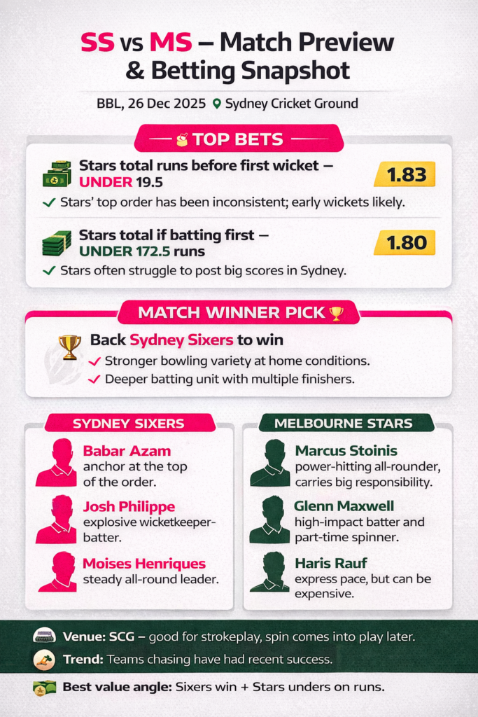 Facing the Sydney Sixers at the SCG is always a demanding assignment, especially for a Stars side still searching for collective consistency. Melbourne will need something special from their big names to overturn the odds, while Sydney’s depth with both bat and ball makes them the more reliable betting option.