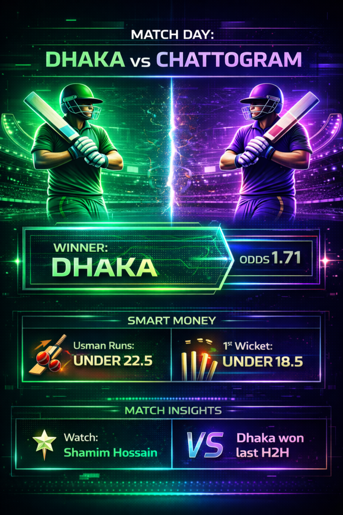 Bettors should tread carefully regarding the venue—historically, Dhaka has struggled here, losing 7 of their last 9 matches at this ground. However, their current squad balance suggests they are poised to break that trend.