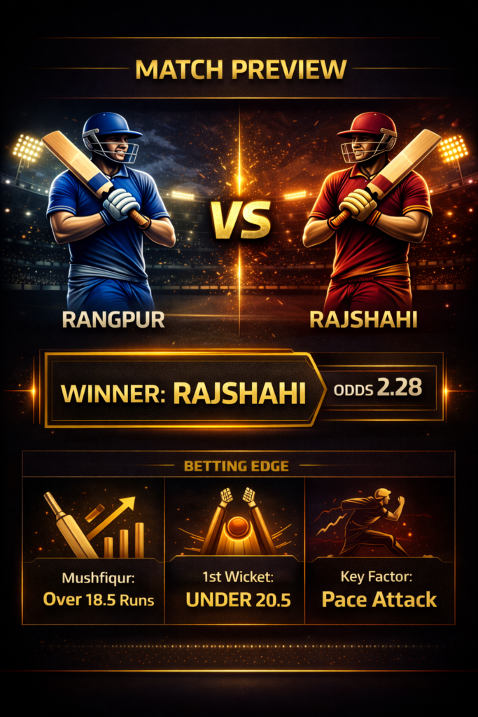 This promises to be a tightly contested affair between two in-form sides. However, the value lies with the underdog odds. We believe the Rajshahi Warriors hold a slight edge due to their superior pace attack—which suits the Sylhet conditions—and the stabilizing presence of Shanto and Rahim in the middle order.