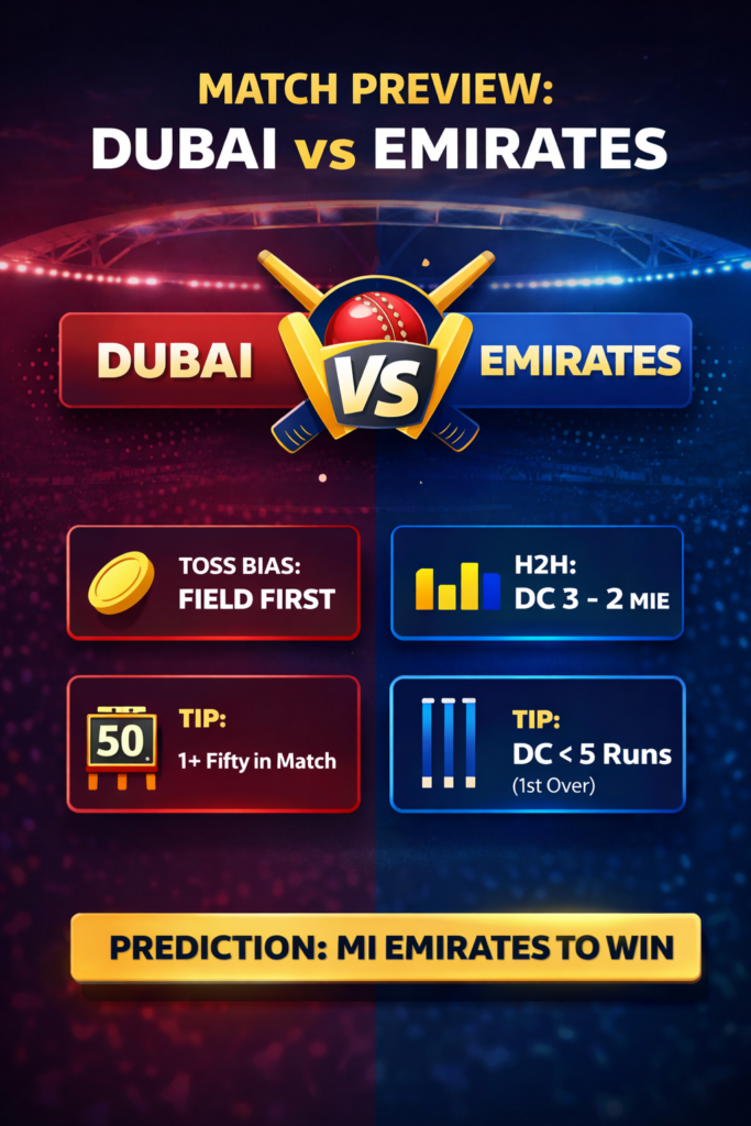While both sides have an identical win-loss record (two wins from five games), the context matters. Both of Dubai Capitals' victories came against a struggling Abu Dhabi Knight Riders side. In contrast, MI Emirates possesses a superior squad "man-to-man," particularly in the batting department. Despite the expected close contest, the Emirates' depth and recent head-to-head win give them the edge.