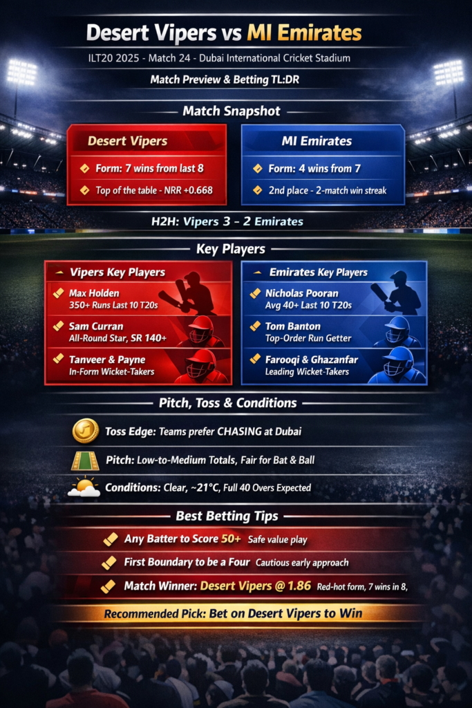 Things are in full swing in the International League T20 in the UAE, and this 24th match at the Dubai International Cricket Stadium pits table‑toppers Desert Vipers against second‑placed MI Emirates in a genuine blockbuster. This article breaks down our match prediction, likely XIs, and the best betting angles to consider before you place your bets.