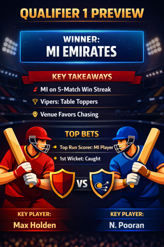 This is a clash of the titans—1st vs 2nd. However, momentum is a huge factor in T20 cricket. MI Emirates are flying with five straight wins, whereas the Vipers have stuttered, losing two of their last five. Crucially, MI won the most recent head-to-head battle between these sides.