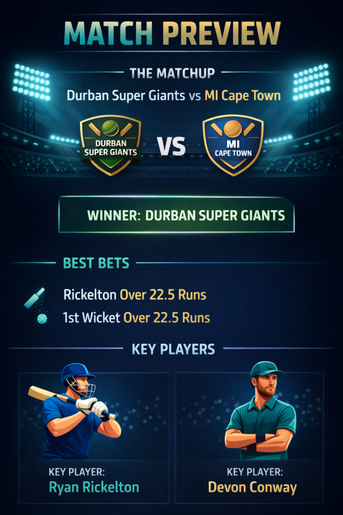 We’re backing the Durban Super Giants to win again. Their strong head-to-head record, in-form batsmen, and recent victory momentum give them the upper hand. MI Cape Town will fight hard, but Durban’s batting depth and home advantage make them our pick for this SA20 clash.