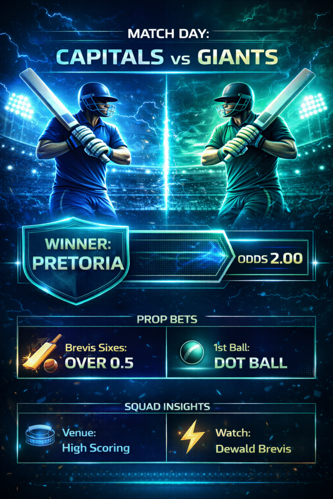 Pretoria Capitals will be looking to entertain their home crowd with a power-packed performance. While Durban's Super Giants have a star-studded lineup, their bowling fragility was exposed against Joburg. The Capitals have found a winning formula, and at home, they offer excellent value to secure the win.
