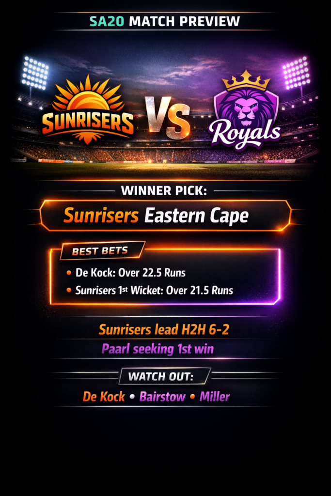 Sunrisers Eastern Cape have been the most balanced side in the tournament so far — strong with both bat and ball — and carry winning momentum. Paarl Royals, on the other hand, look unsettled and short on batting depth, which could hurt them again against a confident Sunrisers outfit.