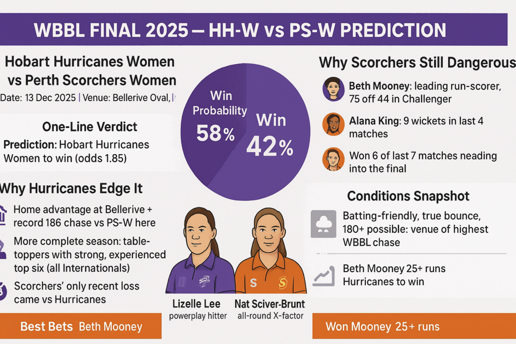 The Hurricanes enter the final as the team to beat, boasting a near-flawless run leading into the playoffs. Their only recent "blemish" was a no-result due to rain, meaning they haven't lost a completed game in weeks. The Scorchers, however, have serious momentum after knocking out the Sixers in the Challenger, winning 6 of their last 7 games, with their only loss coming against the Hurricanes.